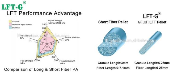 LFT, также известный как длинные армированные волокном термопласты, представляет собой длинный волокнистый материал, который обладает лучшими механическими, тепловыми, электрическими свойствами, чем короткий волокнистый пластик. Долговечные армированные термопластики изготавливаются пултрузионным способом, который смешивает волокна с матричной смолой. Из-за более коротких длинных волокон на конце волокна хорошие свойства наполнения, длинная волокнистая смесь переплетается, флиртует и изгибается в форме. Короткие волокна, расположенные вдоль потока воды, смешиваются. Следовательно, формованное изделие с длинным волокном имеет более высокую гомогенность, чем формованное изделие с коротким волокном. И высокое соотношение прочности к весу длинных армированных волокном композитов делает их идеальной заменой для металлов или материалов, которые плохо работают.